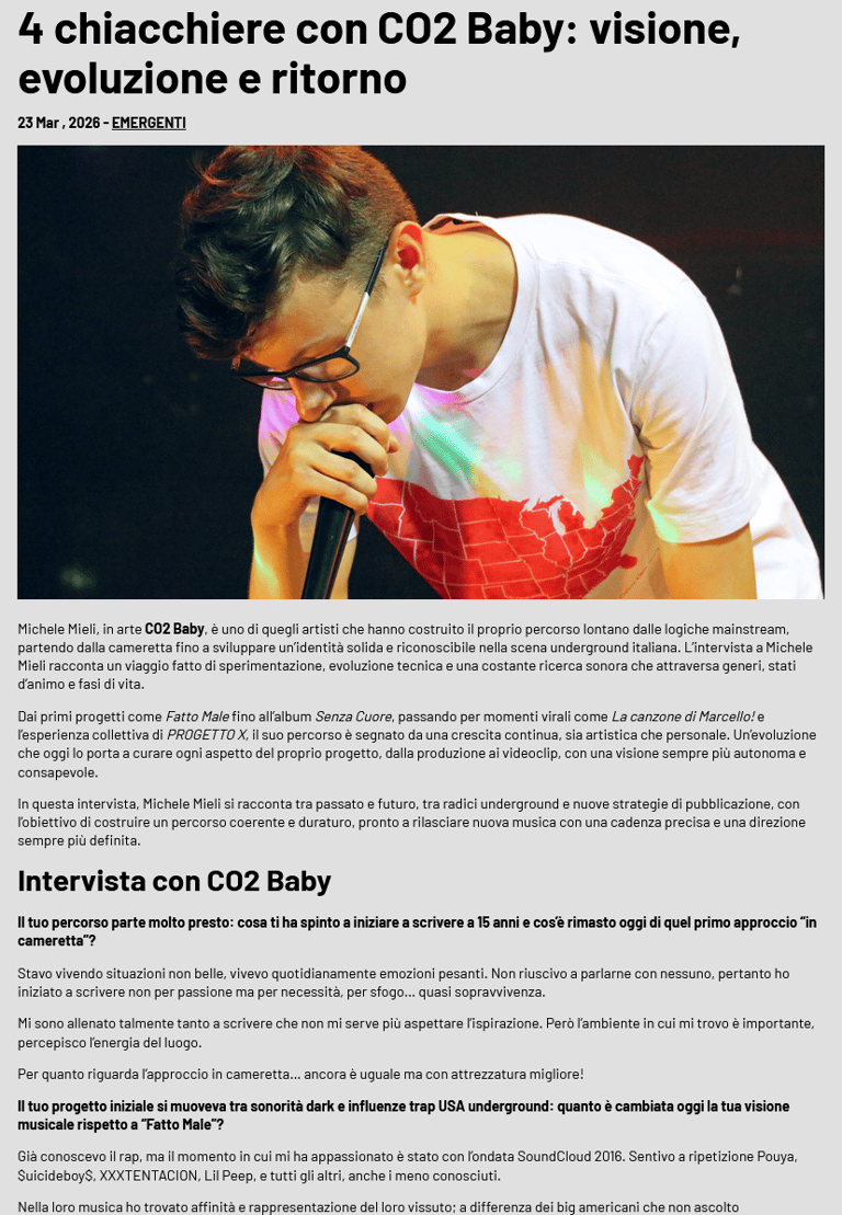 ●In 2021, he releases his first album, "Senza Cuore." His songwriting progress is immediately apparent, becoming more refined; he explores new themes. CO2 Baby worked with 12 different producers; her cousin, Simona Mieli, is the only featuring. The album features several stylistic shifts, while still maintaining its sonic identity throughout the listener's experience.